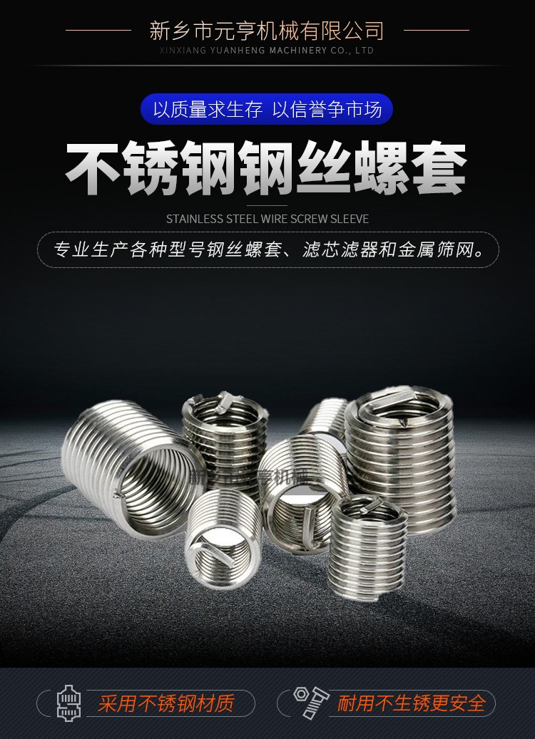 使用標有規定螺紋規格的鋼絲螺套專用絲錐攻絲,攻絲的長度必須超過鋼絲螺套長度,對于通孔,要全部攻絲;攻絲的精度決定終標準內螺孔的公差帶,使用者要適當地選擇攻絲方法和潤滑,盲孔攻絲要適當用力, 以防折斷絲錐。攻絲后,螺紋孔應清理,一般用壓縮空氣噴槍吹,盲孔時還應使用帶徑向孔的長噴槍自下而上清理, 也可以用清洗的方法清理螺紋孔。螺紋孔精度高時,應用專用鋼絲螺套底孔塞規進行檢查。