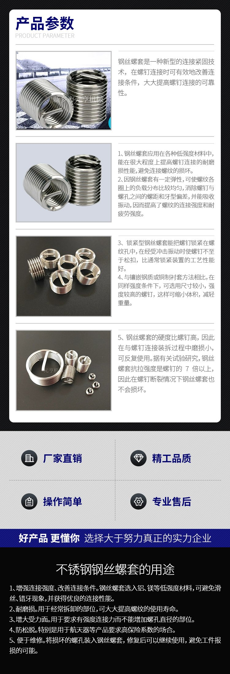 簡易螺紋護套安裝工具有螺紋頭、光桿兩種。用于少量安裝,一般維修、實驗時用,操作時不易安裝,鋼絲螺套容易報廢。